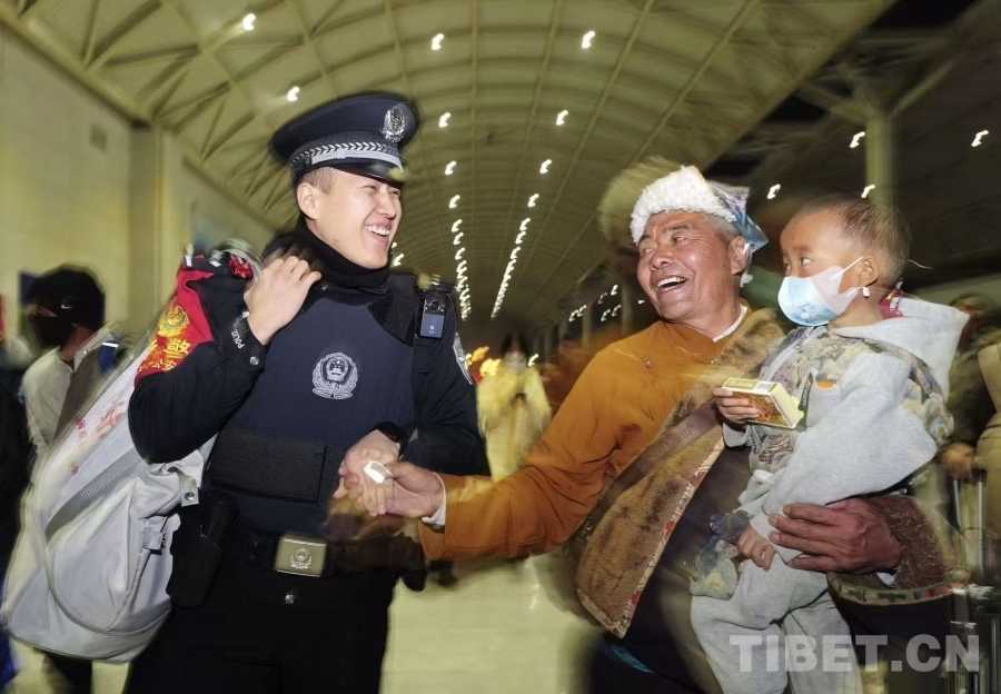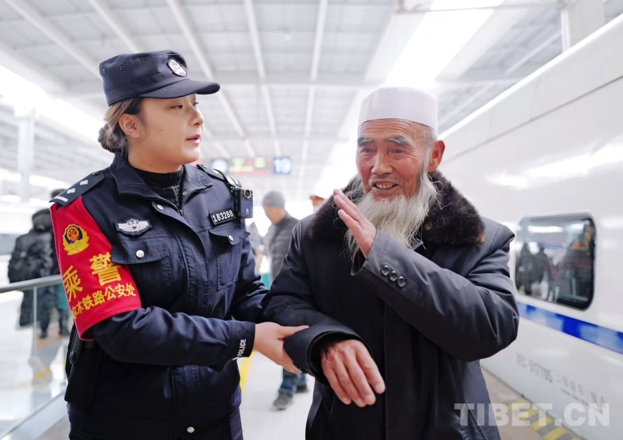 图为西宁铁路公安处乘警暖心帮扶返乡各族群众,用点滴行动守护旅客平安回家路