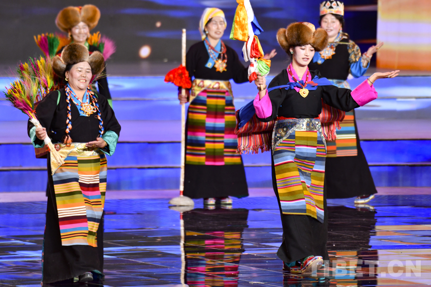 图为2026拉萨藏晚节目《村“T”服饰秀》阿佳央金(左)与村民一起为大家带来精彩传统走秀 摄影:赵振宇