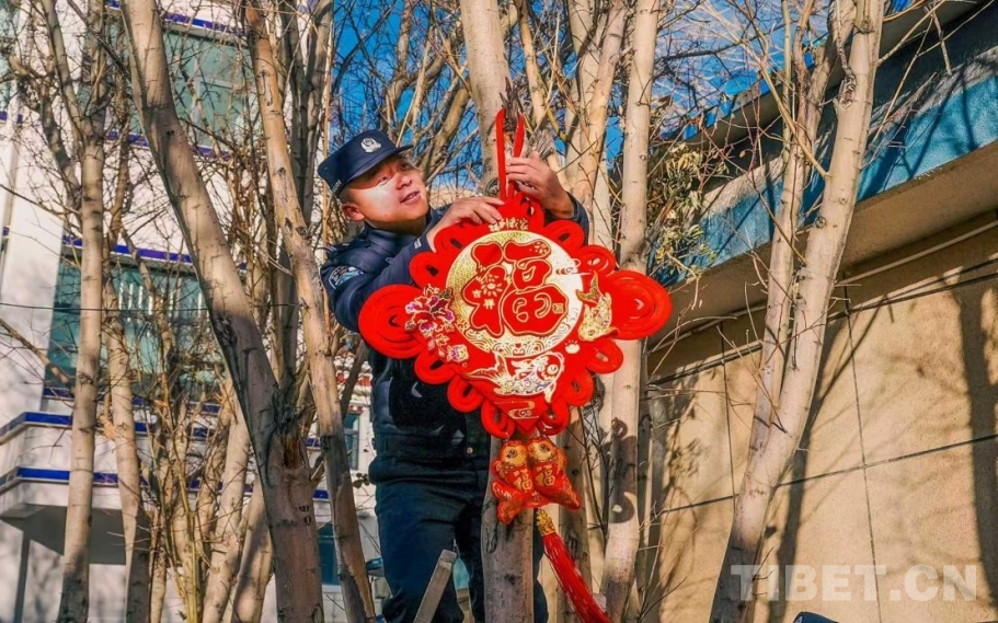 “来来来,搭把手!把这个中国结挂高点,看着喜庆!” 教导员杨曦淙踩着凳子将手中的中国结高高地挂在了树上,新警吴措多杰在下面扶着梯子,仔细调整着高度。另一边,民警们三五成群,有的拿着浆糊贴对联,有的忙着挂彩灯,营区的每一个角落都被点缀得喜气洋洋。