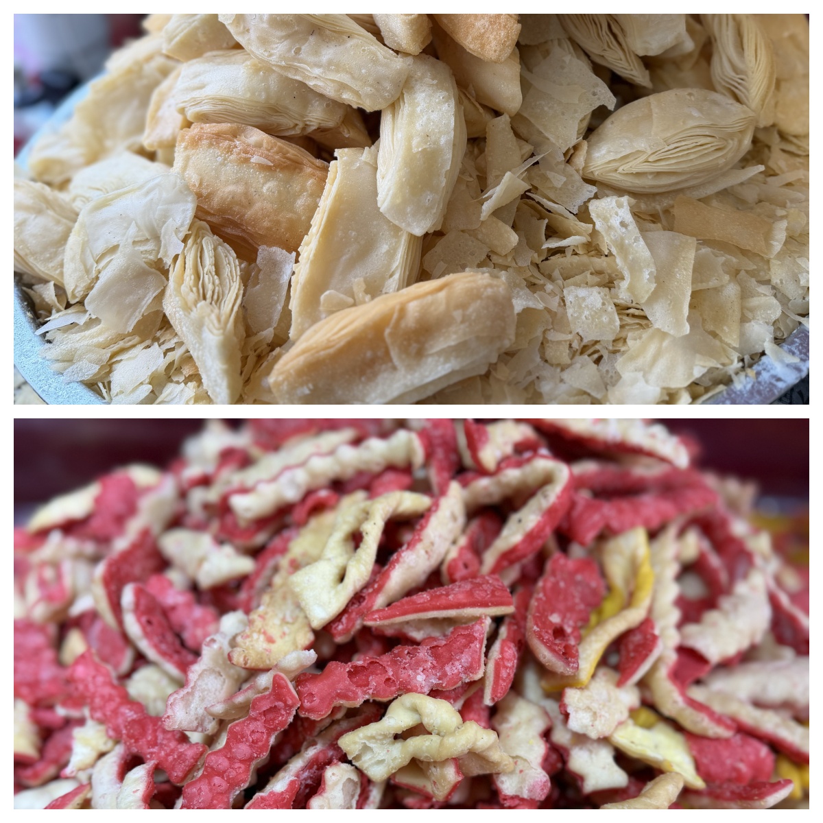 图为卡塞,是一种油炸面食,是藏历新年必备的年货之一。卡塞一般用面粉、酥油、白糖等原料,油炸而成。椭圆形的“果子”、蝴蝶状的“耳朵”……各色造型的“卡塞”寄托着人们对团圆、富足的美好祈愿