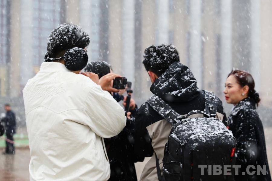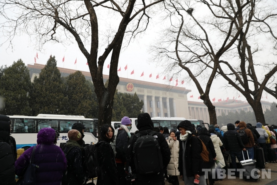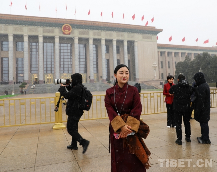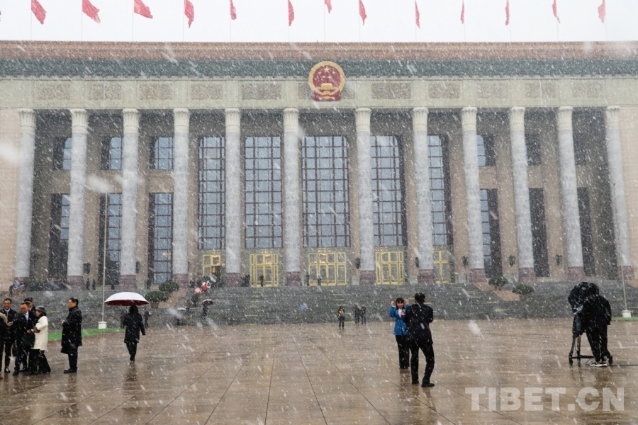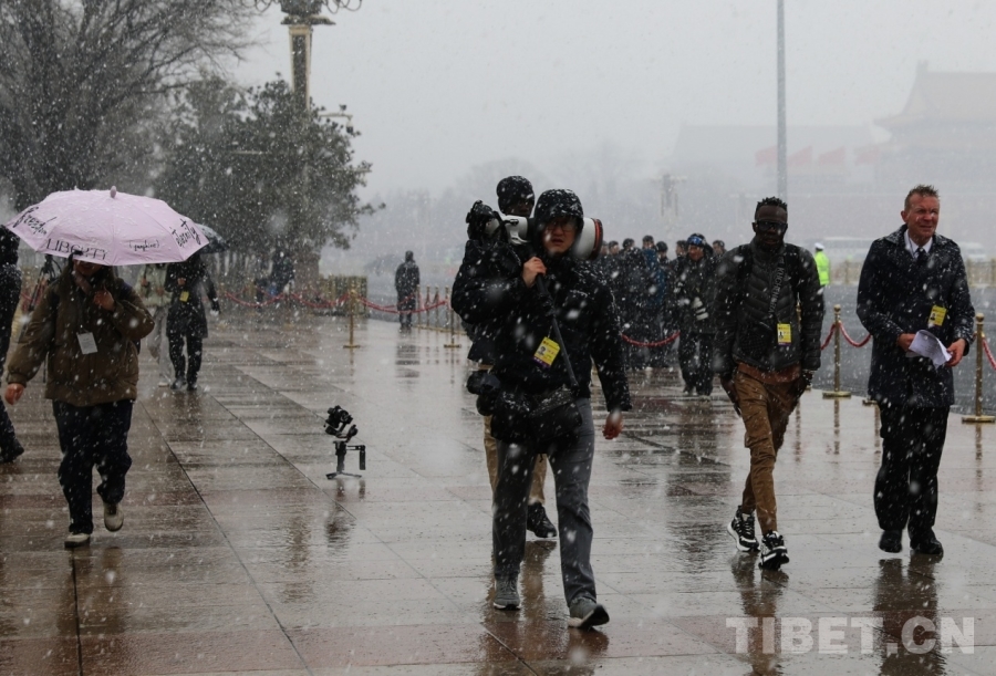 3月4日上午,十四届全国人大四次会议举行预备会议。会议结束后,一场春雪不期而至。在纷扬的大雪中,康巴卫视记者正在工作。摄影:刘莉