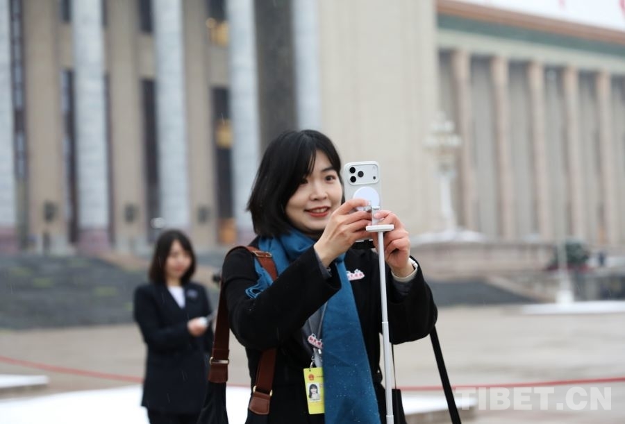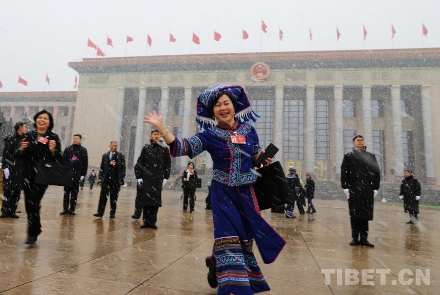 3月4日上午,十四届全国人大四次会议举行预备会议。会后,一场春雪不期而至。走出会场的全国人大代表、广西金秀瑶族自治县桐木中学副校长梁丽斌向记者们挥手致意。