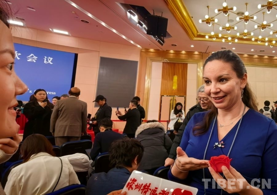 3月8日,在全国两会新闻中心,来自玫瑰之国保加利亚的《言论报》记者塔尼亚·格卢赫切娃开心地收到了深圳特区报记者赠送的“三八节”礼物——一朵美丽的布艺红玫瑰。