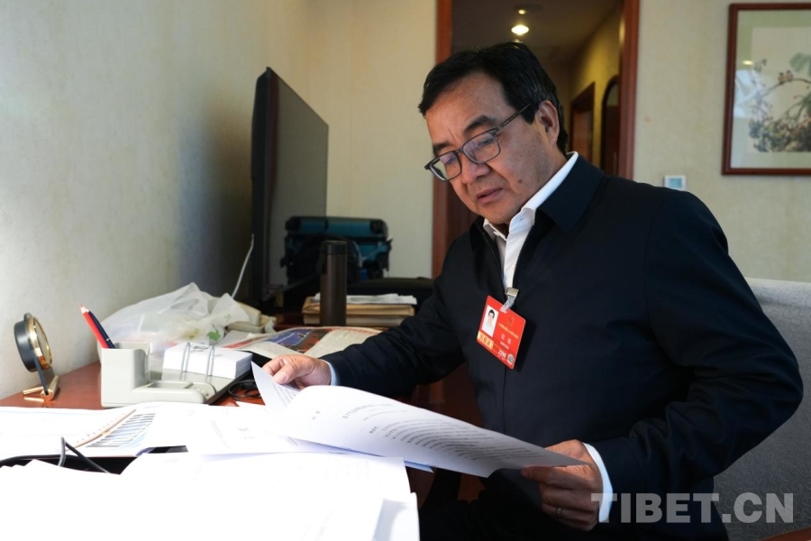 全国人大代表、西藏大学生态环境学院教授拉琼在驻地看文件