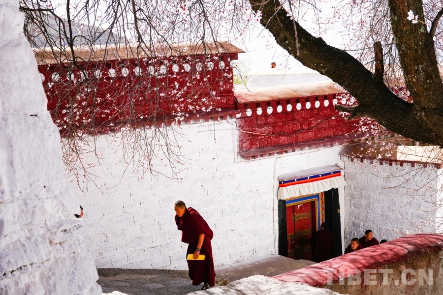帕邦喀寺内,僧人从白墙与桃花下走过,构成春日里的别样风景 摄影:张艺彤