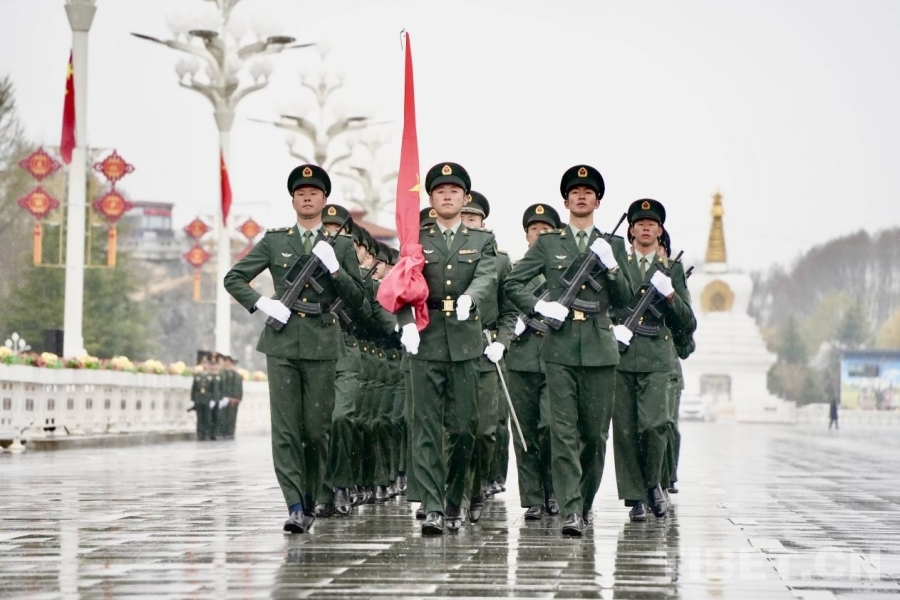 中国西藏网讯 雨雪纷飞,红旗猎猎,布达拉宫广场在飞雪中更显庄严。3月28日上午,西藏自治区各族各界干部群众在拉萨布达拉宫广场参加升旗仪式,庆祝西藏百万农奴解放纪念日。