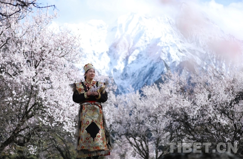 身着嘉黎特色服饰的姑娘,手捧桃枝,在雪山花海的映衬下,喜迎远方来客。