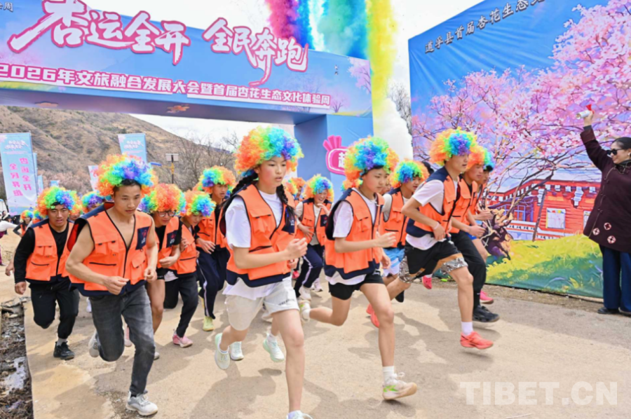 中国西藏网讯 4月2日,道孚县2026年文旅融合发展大会暨首届杏花生态文化体验周系列活动——“‘杏’运全开 全民奔跑”活动,在四川省甘孜藏族自治州道孚县孔色乡麻湾村举行。200多名道孚县的群众、学生头戴彩色假发,身穿橙色马甲,在乡间小道上步伐轻盈,尽情奔跑。
