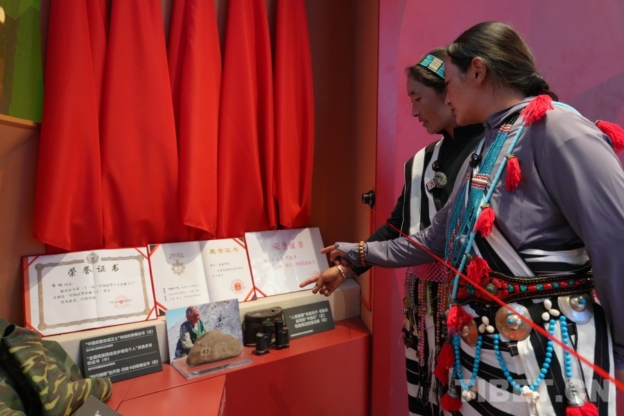 来自山南边境的护边员在民族文化宫看展时指着展品说:“我们在巡边护边途中也会在石头上刻下祖国的名字。” 摄影:王茜