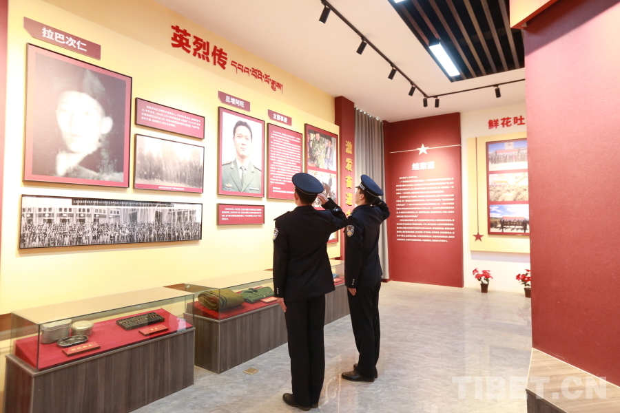 吉隆出入境边防检查站民警在吉隆县烈士陵园烈士纪念馆向旦增阿旺烈士敬礼