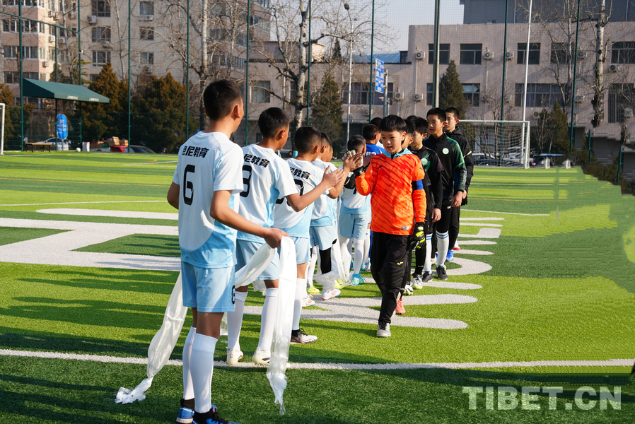 2025年12月29日,京藏少年开展足球联谊赛,赛前击掌,西藏青少年向对方球员献哈达。摄影:宋俊