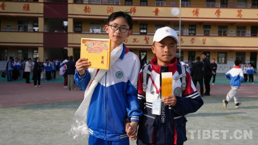 错那市中学的洛桑崔成(右)与繁森希望小学的许玉航手拉手,手拿互赠的礼物合影