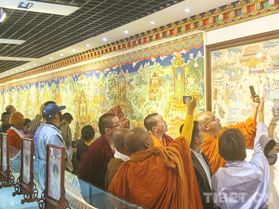 多国宗教界人士在西藏日喀则唐卡学校欣赏唐卡作品 摄影:王淑
