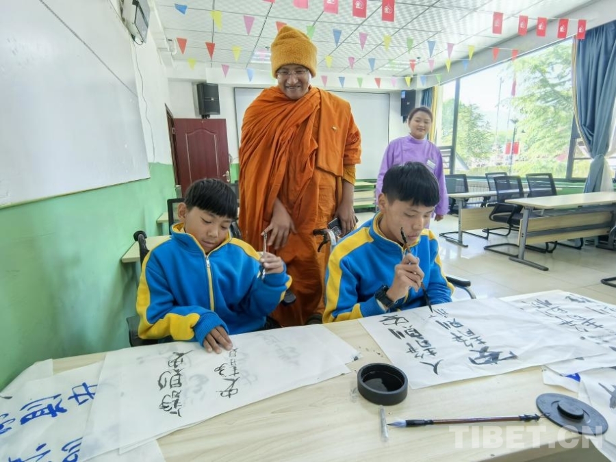 在“美丽工坊”,托养人员正在制作藏香,传承传统制作工艺;绘画室内,他们认真创作着色彩丰富的画作;学习室内,大家练习着“人静则安,安静则顺,心静则胜”的书法作品,多位外国佛教界人士提笔体验“人”字的书写;舞蹈室内,托养人员伴随音乐起舞,展示了为期3个月的学习成果;操场上,大家合唱《感恩的心》,并与参访团成员热情互动。