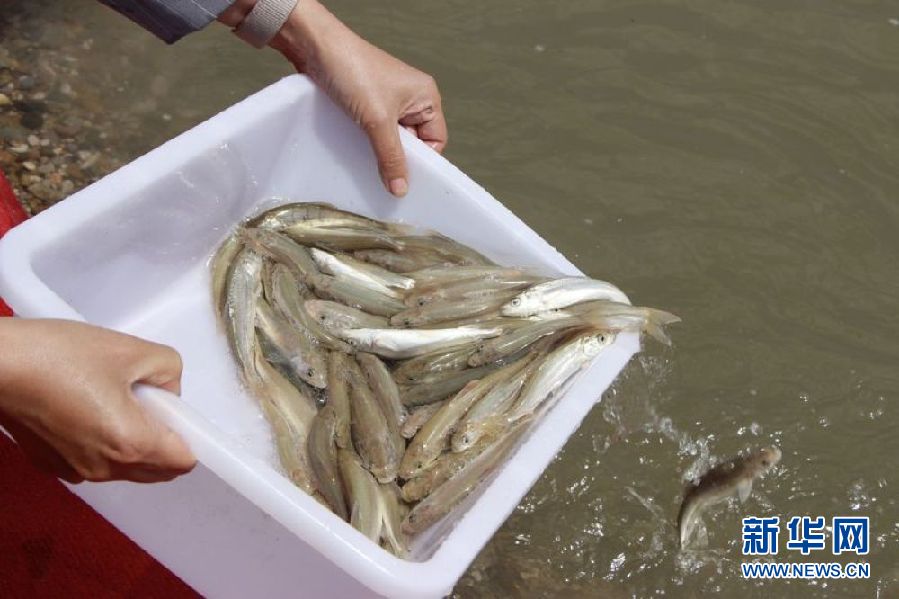 6月6日,当地群众将青海湖裸鲤鱼苗投放到布哈河。新华社记者 周喆 摄