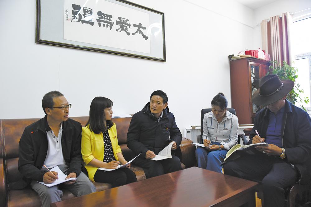 更松尼玛和同事们一起讨论下一阶段的教学任务。张多钧 摄