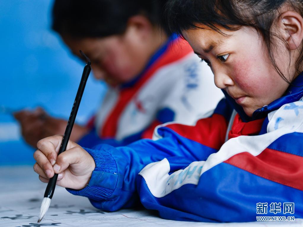在玉树藏族自治州红旗小学,学生在上书法课(3月19日摄)。新华社记者 张龙 摄