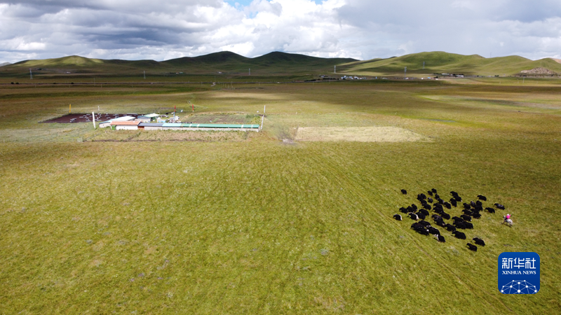 8月16日,在若尔盖县唐克镇,牧民将牦牛赶回圈舍。(无人机照片) 新华社记者 尹恒 摄