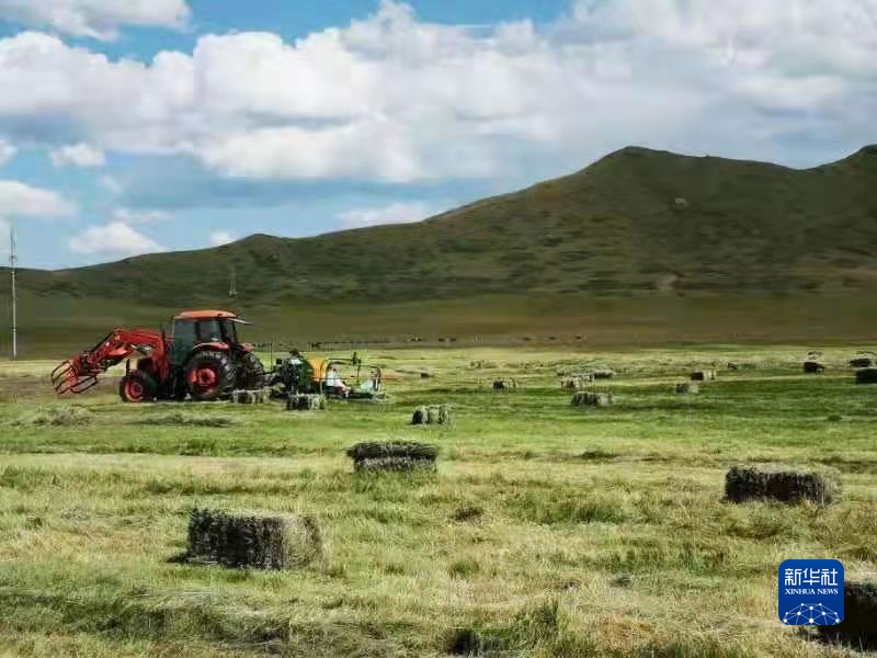 红原县瓦切乡的人工草场上,“牧草服务队”用割草打捆机收割牧草,为牲畜过冬储备草料。新华社发