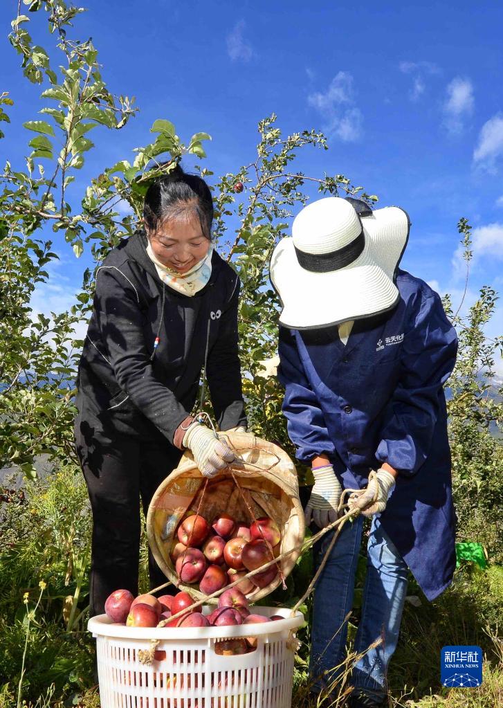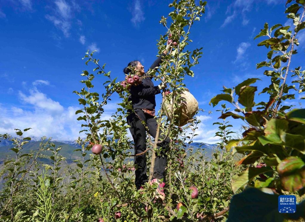 10月20日,在四川甘孜乡城县青德镇万亩果园内,村民在采摘苹果。新华社记者 胥冰洁 摄