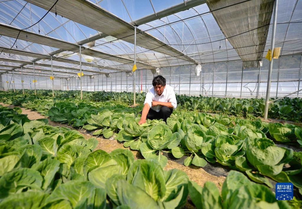 10月25日,村民在位于西地村的生态农业示范基地内查看蔬菜生长情况。新华社记者 刘坤 摄
