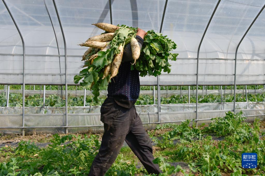 10月25日,村民在位于西地村的生态农业示范基地内搬运萝卜。新华社记者 刘坤 摄