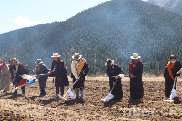 仪式上,绿油油的柏枝上火舌跳动,升起袅袅桑烟,大家载歌载舞,祈求风调雨顺、五谷丰登,歌声、笑声久久回荡在田间地头。“煨桑祈祷”“开耕破土”,每一步仪式都庄严肃穆饱含着农牧民对土地的虔诚。当开耕第一犁破土,藏了一冬的泥土被温柔唤醒;当第一粒种子带着人们的希望和祝福落入大地母亲的怀抱,满怀期望地祈求一年的风调雨顺、五谷丰登。