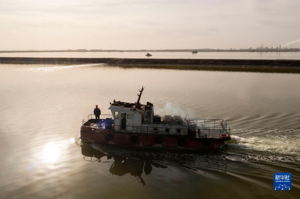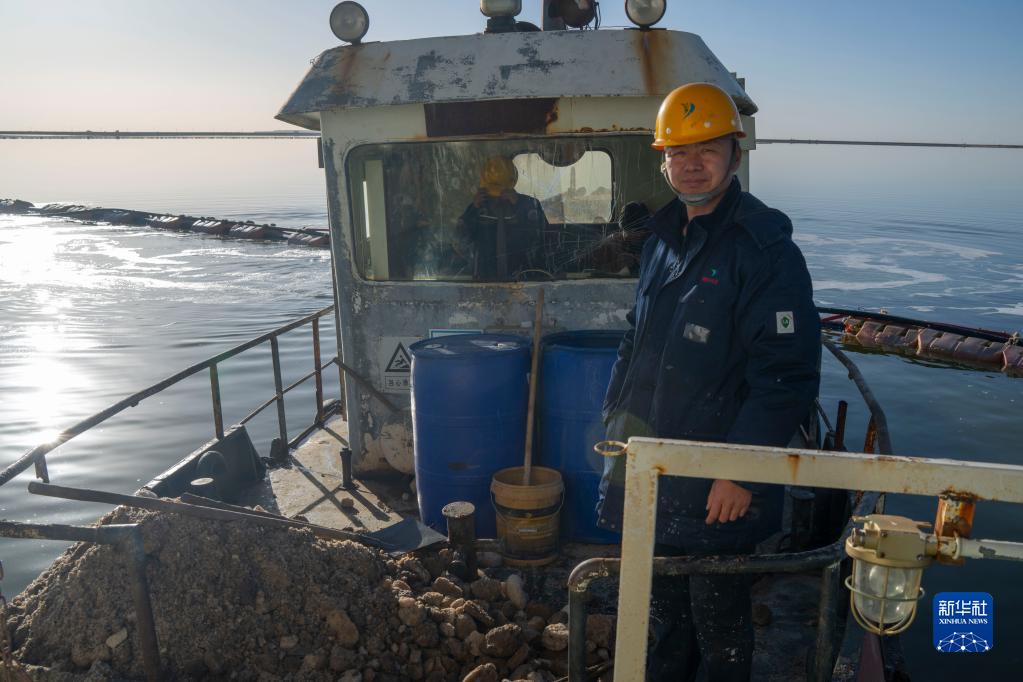 2月2日,贺连福乘坐工作船前往水采船。水采船在剧毒的卤水盐田中作业,工作人员每天上下水采船都要通过工作船接驳。新华社记者 才扬 摄