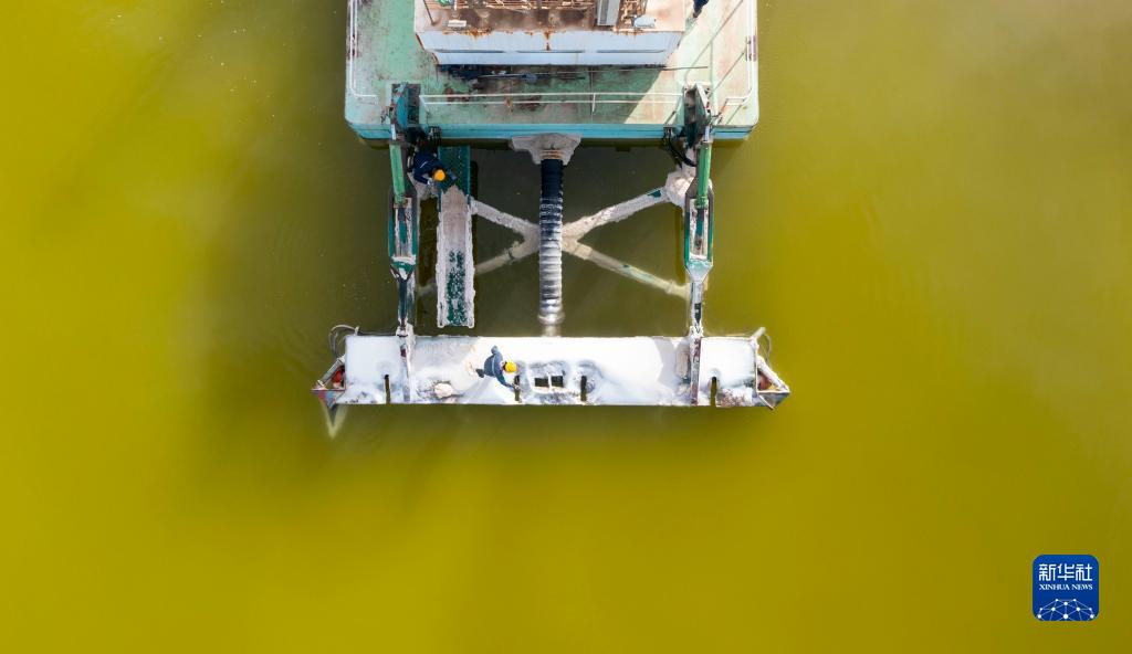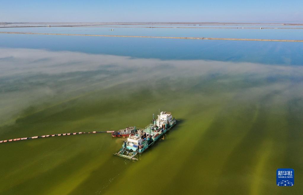 水采船在察尔汗盐湖中作业(2月2日摄,无人机照片)。新华社记者 李贺 摄