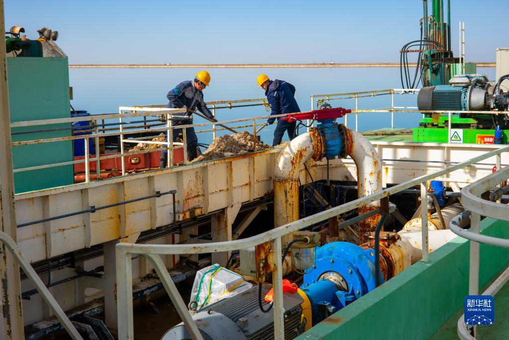 贺连福介绍,盐矿采集工作不轻松,船身各部位的清洁需要人工操作,而且水采工作彻夜不停,船上需要船员24小时轮班值守,防止管道堵塞并及时排除各类故障。以前船上设施简陋、淡水匮乏,如今国产水采船上很多功能都已经实现自动化控制,生活条件也有很大改善。
