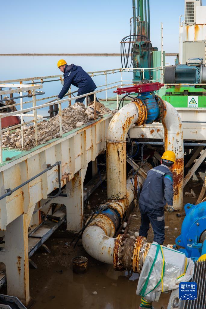 2月2日,贺连福(右)与同事驾驶工作船运输卤水结晶。新华社记者 才扬 摄