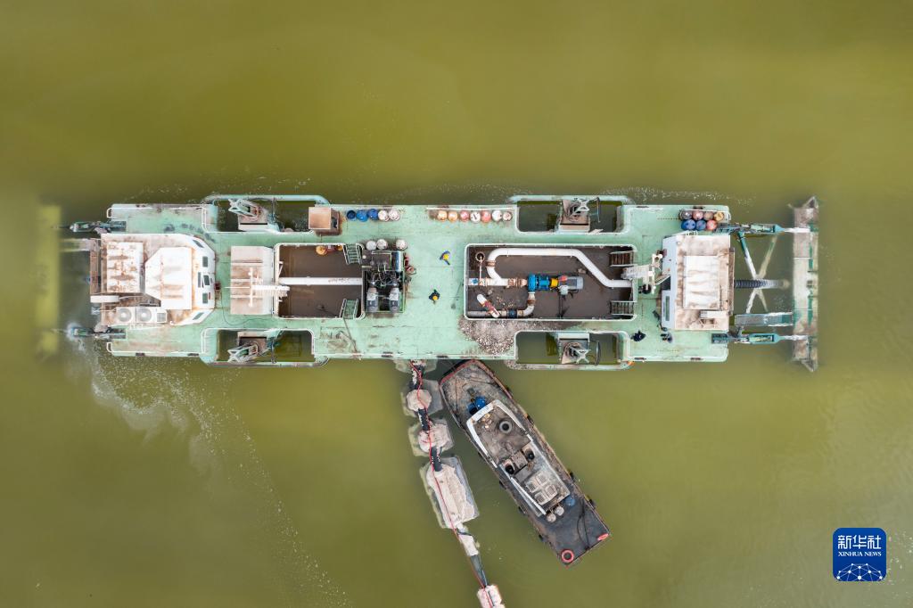 2月2日,贺连福与同事在清除水采船船身上的卤水结晶(无人机照片)。新华社记者 才扬 摄