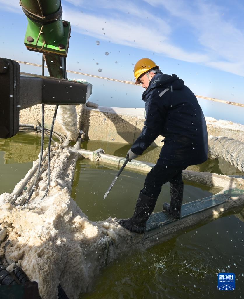 2月2日,贺连福使用工具铲除附着在船体上的卤水结晶。新华社记者 李贺 摄