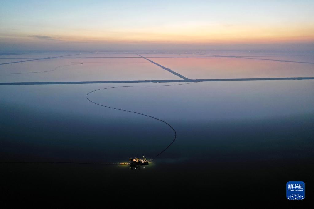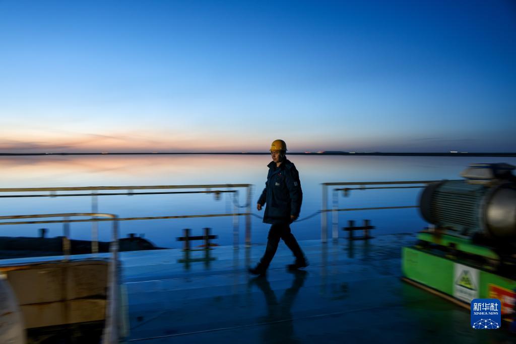 2月2日,在青海省海西蒙古族藏族自治州的察尔汗盐湖,一艘锚船在晨光中工作(无人机照片)。一名水采船船长通常负责管理两个采收小队,采收小队由一艘水采船、一艘工作船、一艘锚船组成。新华社记者 才扬 摄