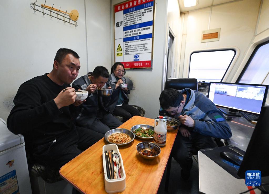 2月2日晚间,贺连福(左一)与同事在水采船上吃晚饭。新华社记者 张龙 摄