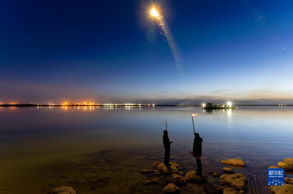 2月2日晚上,贺连福(右)与同事在盐田岸边燃放烟花,迎接即将到来的元宵佳节。新华社记者 刘金海 摄