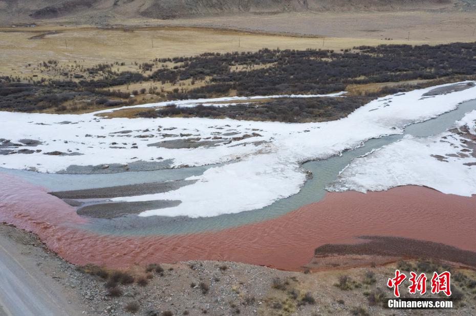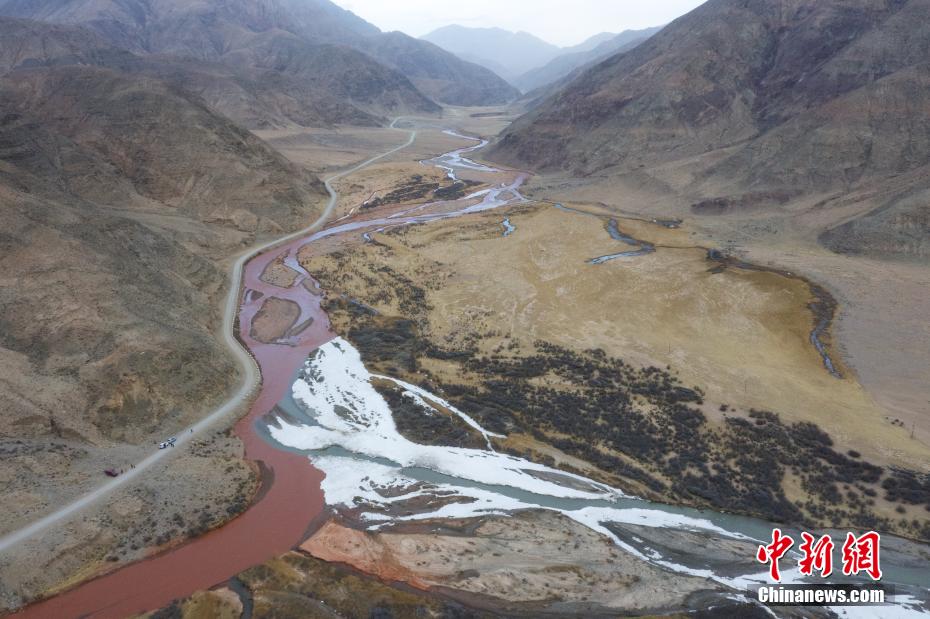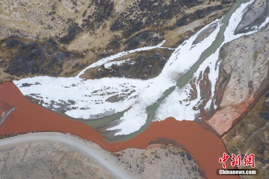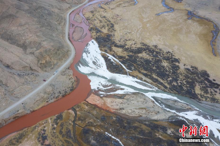 3月20日,青海省海西蒙古族藏族自治州都兰县,航拍两条河流在香加乡洪水川交汇处出现的“泾渭分明”景观。(无人机照片)马铭言 摄