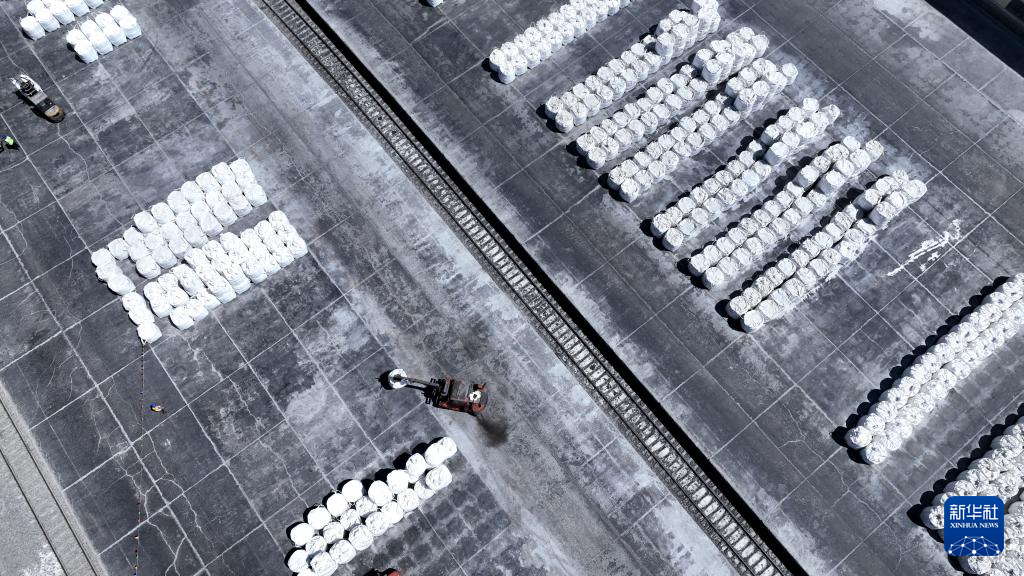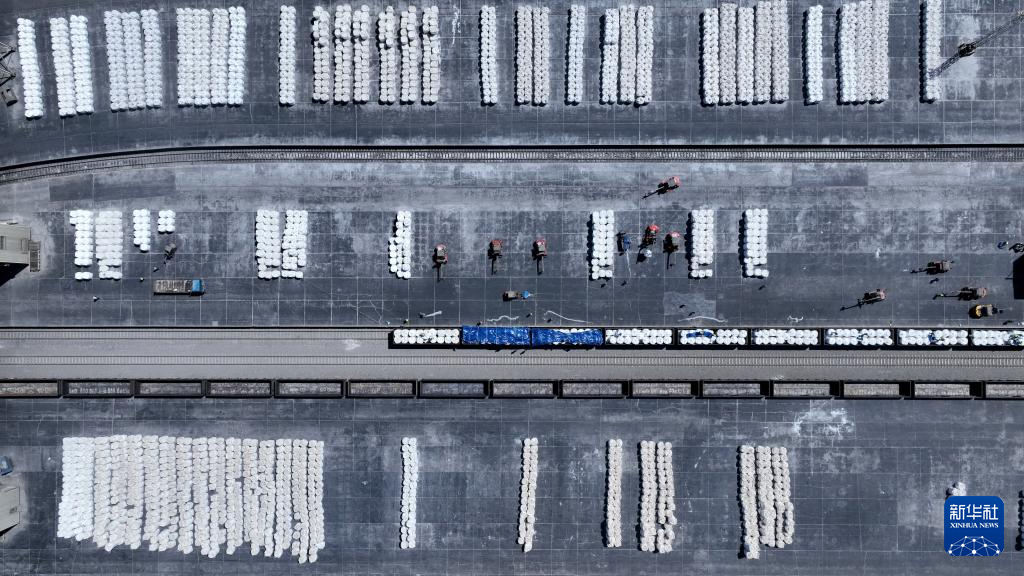 6月12日,在青海盐湖工业股份有限公司钾肥分公司货场,工作人员在装运钾肥(无人机照片)。新华社记者 张宏祥 摄