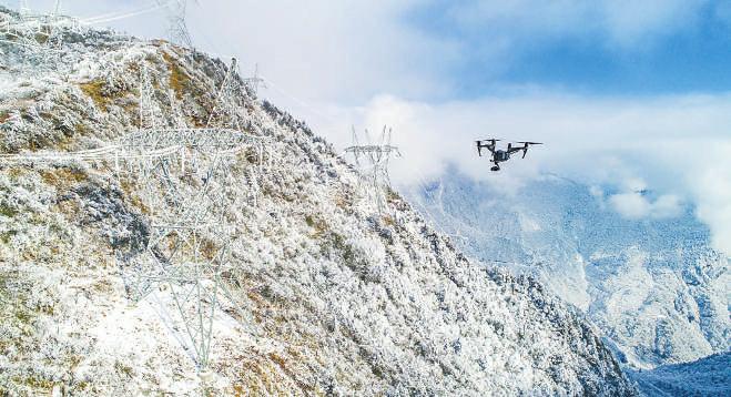 开启定制无人机,电力工人巡检二郎山覆冰线路