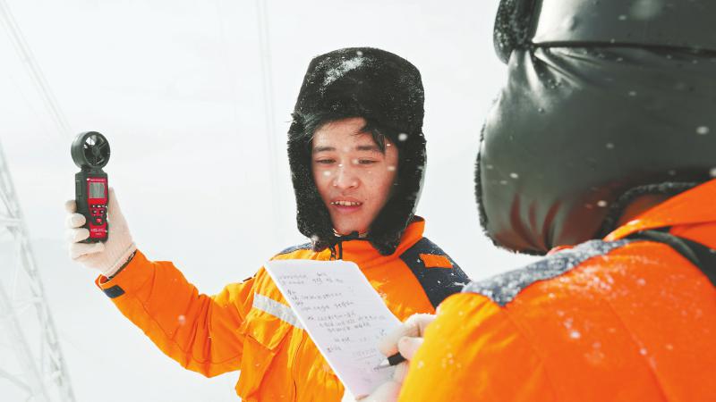 2023年春节前夕,海拔3000米的二郎山上,电力工人正在测量风速。刘湘钒 摄