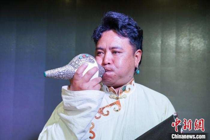 图为乐团成员吹奏吉祥海螺。马铭言 摄