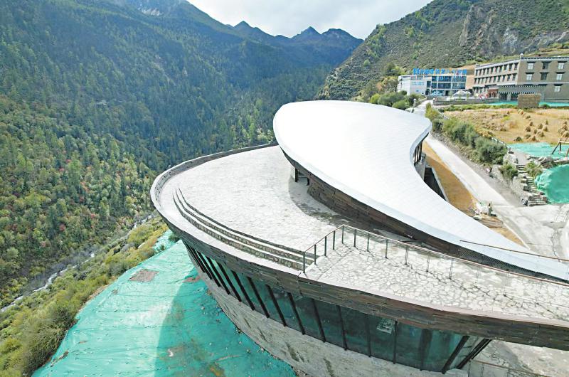 走出展厅就到了“亚丁阳台”,项目总设计师、中建西南设计研究院总建筑师刘艺介绍,阳台与村子以桥相连,其创意是让游客在感知天地辽阔之后,转身又可回归烟火生活。
