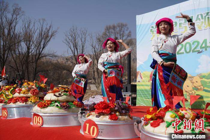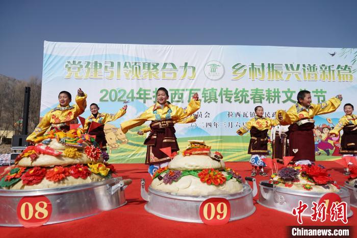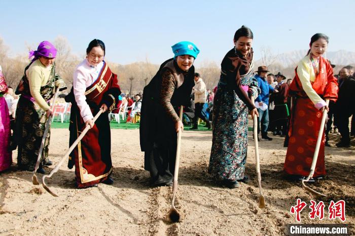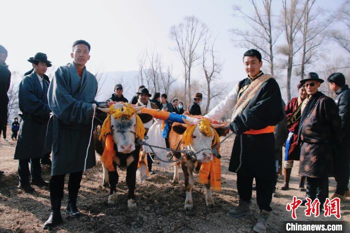 3月6日,青海省海南藏族自治州贵德县拉西瓦镇举办春耕文化节活动。该镇十个村的村民身穿节日盛装,手捧制作精美、色彩鲜艳,寓意风调雨顺、五谷丰登的“彤糕”来到田间,以“二牛抬杠”的传统方式开启今春“第一犁”。