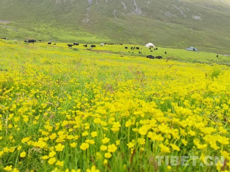 图为春日的俄达门巴村,牛羊蕃盈,格桑琦绣,芳菲漫天