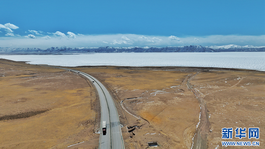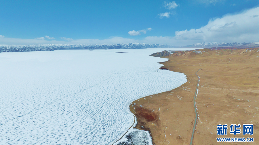 青海冬格措纳湖冬景:半湖碧水半湖冰