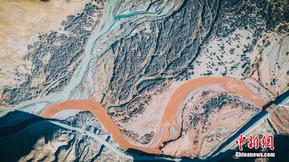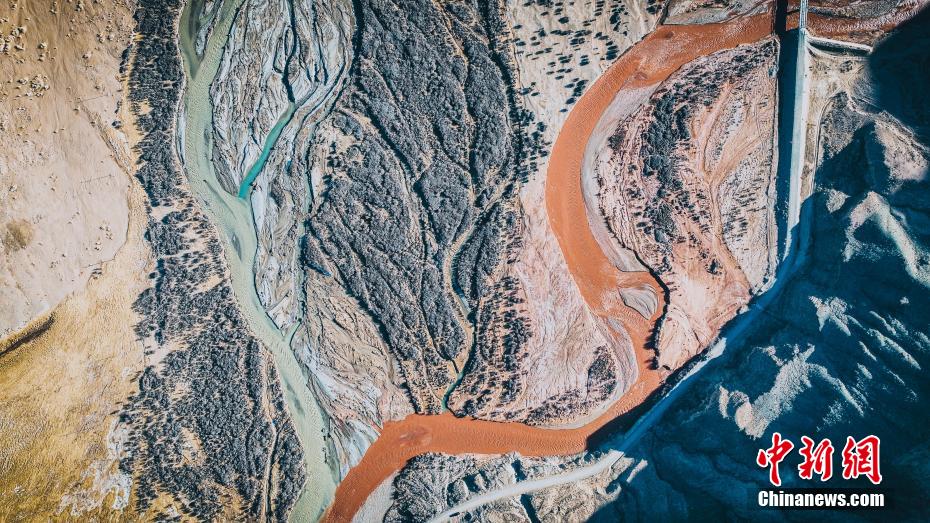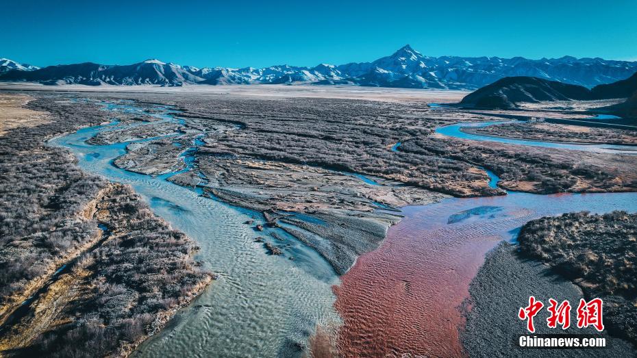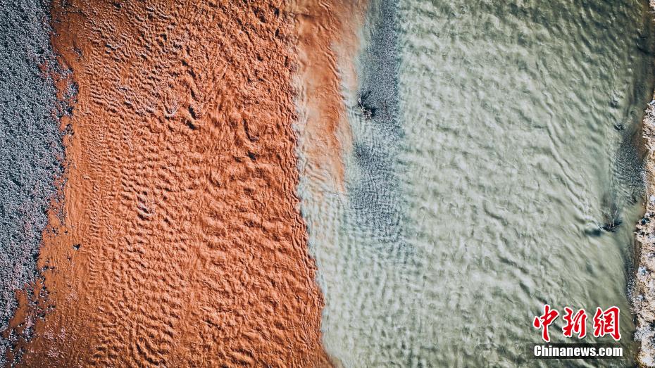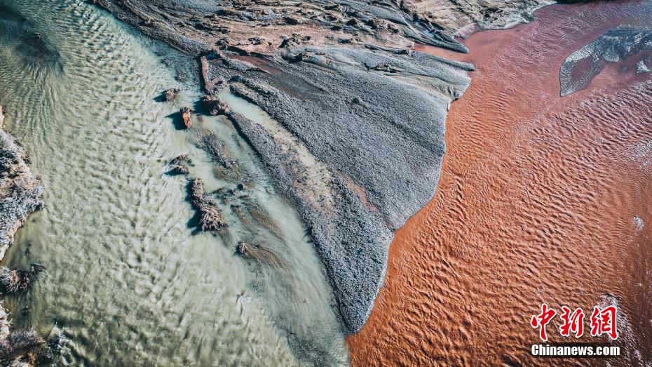 4月7日,摄影爱好者在青海省海西州都兰县香加乡洪水川交汇处拍摄到两条河流“泾渭分明”的景观。