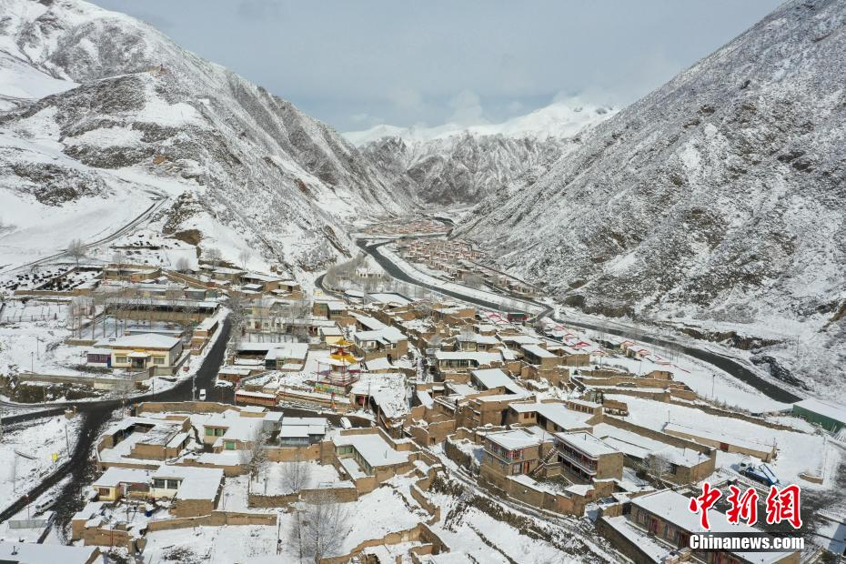航拍降雪后的青海省玉树藏族自治州玉树市益曲卡山庄。马铭言 摄