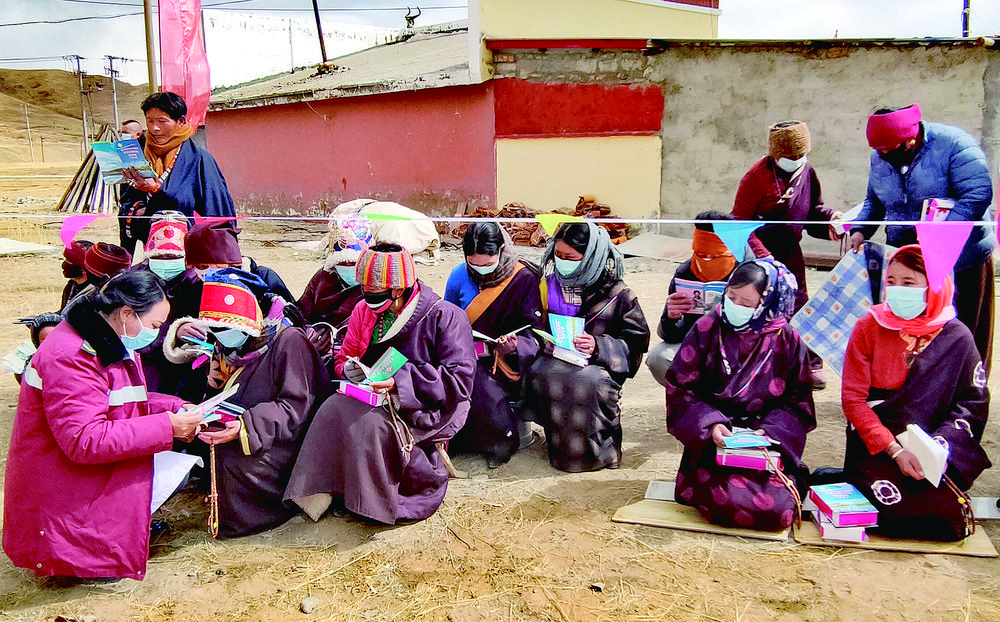 尼玛拉毛(左)入村为牧民讲解健康知识。 本文图片由尼玛拉毛提供