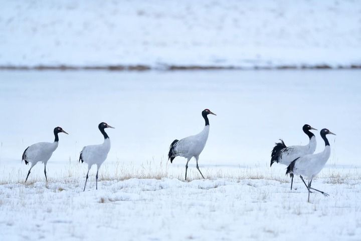 2021年10月21日,在青海省的三江源国家公园黄河源园区内拍摄的黑颈鹤。新华社记者 张龙 摄