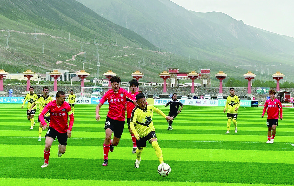 6月9日,“大美青海 高原足球”超级联赛进入第三轮赛程,青海省玉树藏族自治州综合体育场迎来玉树牦牛队对阵西宁夏都队的比赛。